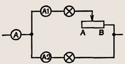 Задание 1388. В цепь (рис. 344) включены две одинаковые лампы При положении ползунка реостата в точке В амперметр А1 показывает силу тока 0,4 А. Что показывают амперметры А та А2? Изменятся ли показания амперметров при передвижении ползунка к точке А?