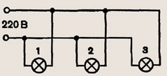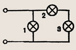 Задание 1412. Три лампы одинаковой мощности, рассчитанные на одно и то же напряжение, включены в цепь так, как показано на рисунке 349. Одинаковым ли будет накал нитей ламп, если цепь замкнуть?