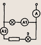 Задание 1419. В сеть напряжением 120 В параллельно включены две лампы: 1 — мощностью 300 Вт, рассчитанная на напряжение 120 В, и 2, последовательно соединенная с резистором, — на 12 В (рис. 350). Определите показания амперметров А1 и А и сопротивление резистора, если амперметр А2 показывает силу тока 2 А.