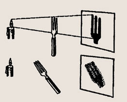 Задание 1510. Если вилку расположить вертикально параллельно пламени свечи (рис. 376), то тень от зубьев воспроизводит на экране их четкое очертание. Если вилку повернуть на 90°, т. е. расположить перпендикулярно пламени свечи, то тень на экране получается размытой и зубьев не видно. Почему?