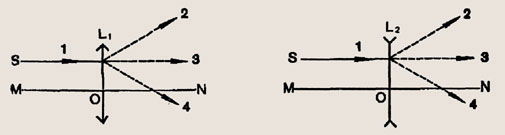 Задание 1591. Какой из трех лучей 2, 3 или 4, изображенных на рисунке 413 штриховой линией, является продолжением светового луча 1 после преломления его в линзе L1 в линзе L2?