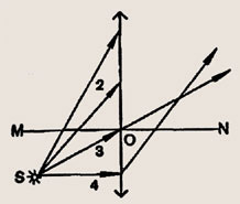 Задание 1592. Из точки S на линзу падают четыре луча (рис. 414). Начертите дальнейший ход лучей 7 и 2 после преломления в линзе.