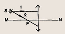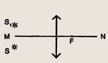 Задание1595. Относительно оптической оси MN линзы L точечный источник света S расположен так, как показано на рисунке 417, где F — фокусное расстояние линзы. Постройте изображение этого источника; определите его положение относительно линзы.