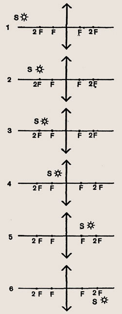 Задание1597. На рисунке 419 схематически показаны 6 различных положений светящейся точки S относительно линзы с фокусным расстоянием F. Найдите изображения светящейся точки в каждом случае. Обозначьте их буквой S'. Укажите, в каком случае изображение действительное, а в каком — мнимое.