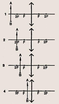 Задание 1598. Постройте изображение предметами, даваемое линзой с фокусным расстоянием F, для случаев 1—4 (рис. 420). Охарактеризуйте каждое изображение.