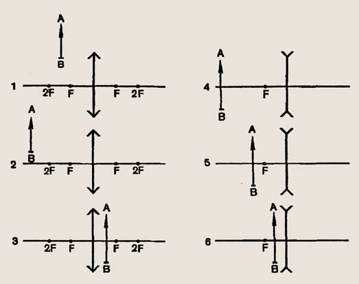 Задание 1600. Постройте изображение предмета АВ, даваемое линзами с фокусным расстоянием F, для случаев 1—6 (рис. 422). Охарактеризуйте каждое изображение.