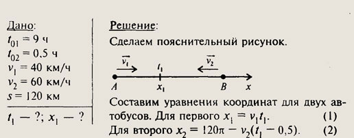 Второе тело находится в движении на 0,5 ч меньше первого, поэтому (t1 — 0,5) ч — это его время движения. Так как в месте встречи тела имеют одинаковые координаты и время встречи одинаковое, то, приравняв уравнения (1) и (2), найдем время движения автобусов до встречи и, подставив его в уравнение (1), найдем расстояние места встречи от точки А. v1 • v2 = 120- v2(t1 - 0,5); 40t1 = 120-60 (t1 -0,5); 40t1 = 120 - 60t + 30; 100t1 = 150; t1 = 1,5(4); х1 = 40 - 1,5 = 60 (км). Автобусы встретятся 4ерез 1,5 ч после выхода первого автобуса в 60 км от точки А.