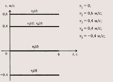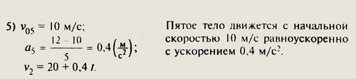 — начальная координата тела, х — координата тела через время t. Для тела 1: v1 = (1 - 1): 4 = 0, т. е. скорость тела равна 0. Для тела 2: v2 - (3 м - 0 м): 5 с = 0,6 м/с. Для тела 3: v3 = (6 м - 4 м) : 5 с = 0,4 м/с. Для тела 4: v4 = (8 м - 6 м) : 5 с = 0,4 м/с. Для тела 5: v5 = (8 м - 10 м): 5 с = -0,4 м/с, т. е. тело движется навстречу телам 1, 2, 3 и 4. 2. Точки пересечения графиков говорят, что тела либо встречается при движении либо одно тело догоняет другое. По данному рисунку видно, что 2-е тело догнало 1-е тело приблизительно через 1,5с после начала своего движения. 5-е тело встречалось с 4-м телом через 5 с после начала движения. 3.