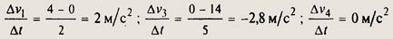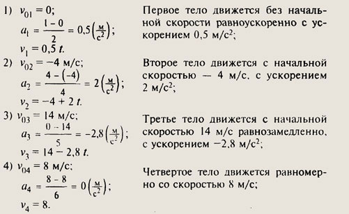 I. Начальные скорости движения - точки пересечения графиков функций с осью v. Так v01 = 0 (м/с); v02 = 14 (м/с); v04 = 9 (м/с); v04 = 8 (м/с). II. Приращение скорости за 1 с обозначим ▲v/▲t, здесь ▲v -изменение скорости за время ▲t.