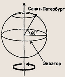 Задание 169. Для точек земной поверхности на широте Санкт-Петербурга (60°) определите линейную скорость и ускорение, испытываемое ими вследствие суточного вращения Земли (рис. 33). Радиус Земли считайте равным 6370 км.