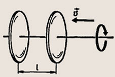 Задание 170. Ось с двумя дисками, расположенными на расстоянии 0,5 м друг от друга, вращается с частотой 1600 об/мин, (рис. 34). Пуля, летящая вдоль оси на некотором расстоянии от нее, почти без изменения скорости пробивает оба диска. При этом отверстие от пули во втором диске смещено относительно отверстия в первом диске на угол, равный 12°. Определите скорость пули на участке между дисками.