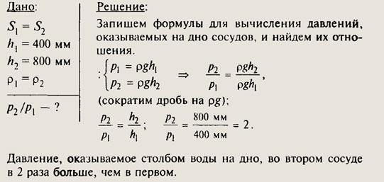 1. Больше налито воды в левый сосуд, так как его объем больше. 2. Давление на дно в этих сосудах одинаково, так как высота столбов одинакова.