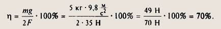Как мы видим из предыдущей задачи и задачи № 792. для нахождения КПД блока (и подвижного, и неподвижного) не нужно знать высоту подъема груза. Так что высота приведена на рисунке только в качестве иллюстрации. Масса поднимаемого груза равна m = 5 кг. При этом к веревке на конце приложена сила F= 35 Н. Воспользуемся формулой для КПД подвижного блока, полученной в предыдущей задаче: