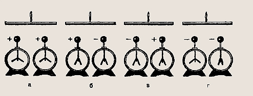 через некоторое время листочки электроскопов заняли положения, изображенные