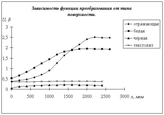 ãäå: j= 0,1... - íîìåð ýêñïåðèìåíòàëüíîé òî÷êè ôóíêöèè ïðåîáðàçîâàíèÿ; n - ÷èñëî ïîëó÷åííûõ çíà÷åíèé ôóíêöèè ïðåîáðàçîâàíèÿ (n=11); A j - îòêëèê ÂÎÄ ïðè j-îì çíà÷åíèè âõîäíîãî ïàðàìåòðà; D õ i - ïðèðàùåíèå âõîäíîãî ïàðàìåòðà ( D õ i =0,1 ìì). Часть 2. Исследование влияния условий (типа поверхности) на функцию преобразования. Измерения производятся для четырех типов поверхности: белая бумага, черная бумага и текстолит с двух сторон. Измеряем напряжение на выходе датчика в точках от x=0 до значения, при котором напряжение будет максимальным, с шагом 200 мкм.