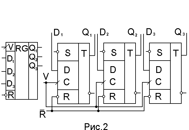 2.1. Устройство, называемое регистром, служит в основном для хранения чисел в двоичном коде при выполнении над ними различных арифметических и логических операций. С помощью регистров выполняютоя такие действия над числами, как передача их из одного устройства в другое, арифметический и логический сдвиг в сторону младших или старших разрядов, преобразование кода из последовательного в параллельный и наоборот и т.д. Функциональная схема и условно - графическое обозначение регистра параллельного типа, собранного на универсальных Д-триггерах, приведена на рис.2 .