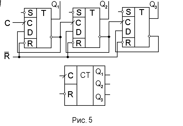 Функциональная схема и условнографическое обозначение двоичного счетчика с коэффициентом пересчета 2 3 представлена на рис.5.