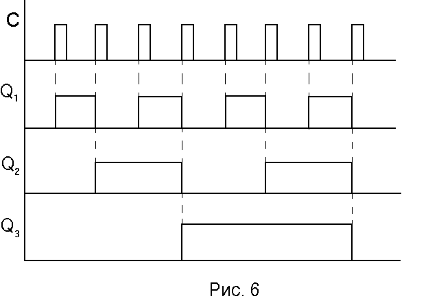Каждый поступающий на вход счетчика импульс перебрасывает первый триггер в противоположное состояние (рис.6). Сигнал с инверсного выхода предыдущего триггера является входным сигналом для последующего и, таким образом, комбинация сигналов на выходах Q 1 , Q 2 , Q 3 будет соответствовать числу поступивших на вход счетчика импульсов, представленному в двоичном коде. Счетчик данного типа называется асинхронным счетчиком.