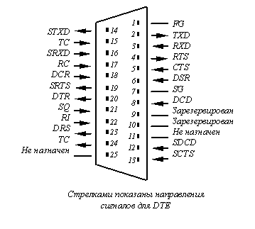 Рис. 1. Назначение линий 25–контактного разъема типа D для интерфейса RS–232C
