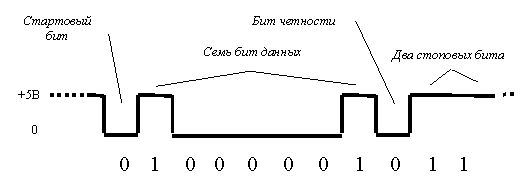 Наиболее широко распространен формат, включающий в себя один стартовый бит, один бит паритета и два стоповых бита. Начало пакета данных всегда отмечает низкий уровень стартового бита. После него следует 7 бит данных символа кода ASCII. Бит четности содержит 1 или 0 так, чтобы общее число единиц в 8–битной группе было нечетным. Последним передаются два стоповых бита, представленных высоким уровнем напряжения. Эквивалентный ТТЛ–сигнал при передаче буквы А показан на рис. 2.