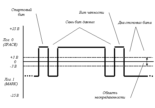 Используемые в интерфейсе RS–232C уровни сигналов отличаются от уровней сигналов, действующих в компьютере. Логический 0 (SPACE) представляется положительным напряжением в диапазоне от +3 до +25 В, логическая 1 (MARK) — отрицательным напряжением в диапазоне от –3 до –25 В. На рис. 3 показан сигнал в том виде, в каком он существует на линиях TXD и RXD интерфейса RS–232C.