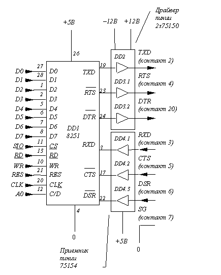На рис. 4 представлен типичный микрокомпьютерный интерфейс RS–232C. Программируемая микросхема DD1 последовательного ввода осуществляет параллельно–последовательные и последовательно–параллельные преобразования данных. Микросхемы DD2 и DD3 производят сдвиг уровней для трех выходных сигналов TXD, RTS, DTR , а микросхема DD4 — для трех входных сигналов RXD, CTS, DSR . Микросхемы DD2 и DD3 требуют напряжения питания ± 12 В.