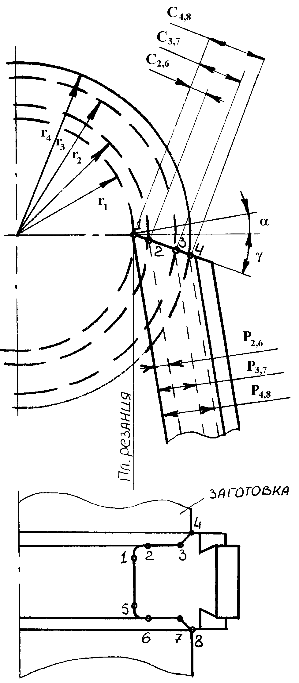 1. На высоте центра Он вращения детали распологается та узловая контурная точка 1 фасонного профиля режущего лезвия, которая лежит на наименьшем радиусе r1. Расположение остальных узловых точек определяется пересечением передней поверхности резца с окружностями детали радиусами r2, r3, r4. (Рис. 2)