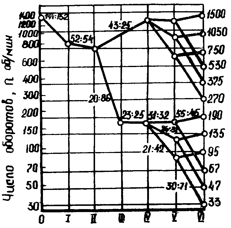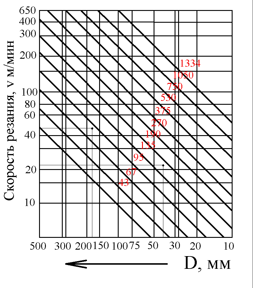 где v – скорость резания; м/мин D – диаметр заготовки или инструмента; мм n – частота вращения шпинделя; об/мин Лучевая диаграмма скоростей служит для быстрого определения n по заданным v и D.