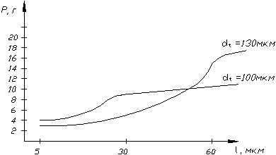 Рассмотрим зависимость прочности сварного соединения от Æ сварного инструмента и расстояния от КП до защитного кольца. На рис. ... приведены зависимости P=f(l) для случаев использования сварочных инструментов с рабочим торцом Æ 100, 130 мкм. Согласно рисунку 9 при l=30 мкм ( Æ 100) прочность стабилизируется, однако, окончательная стабилизация прочности наступает при l=40-50 мкм, т.к. при l=30 мкм имеет место отрыв по месту сварки в 50% случаев, из-за напряженного состояния узла. При размере торца сварочного инструмента Æ 130 мкм при l=30 мкм еще сказывается эффект "подреза", и превышение средней прочности сварных соединений при l=60 мкм объясняется увеличением зоны взаимодействия.