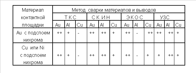 P.S. Размеры без скобок обозначает длину сварного соединения, а в скобках - ширину сварного соединения. В зависимости от материала вывода и контактной площадки используют термокомпрессионную сварку (ТКС), сварку косвенным импульсным нагревом (СКИН), электроконтактную одностороннюю сварку (ЭКОС) сдвоенным инструментом и ультразвуковую сварку (УЗС). Определяющей тенденцией развития методов микросварки от ТКС до УЗС является локализация зоны нагрева, что уменьшает тепловое воздействие на изделие в целом и повышает воспроизводимость параметров сварного соединения.