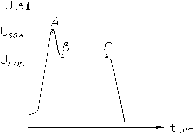 Причины появления свечения поясним на примере рассмотрения газоразрядного промежутка между двумя электродами, находящимися в среде инертного газа (обычно неона Ne или ксенона He) либо их смесей см. Рис 5. Если к электродам приложить малое напряжение U (U<U ЗАЖ ) то в цепи будет протекать малый ток, обусловленный наличием в газе небольшого числа ионов, возникших вследствие воздействия теплоты, падающего света и космического излучения, а также вызванный эмиссией (излучением) электронов из электрода, находящегося под отрицательным потенциалом (катода). Это так называемый темновой разряд, при котором нет видимого свечения газа. С повышением напряжения электроны, эмиттируемые катодом, приобретают большие скорости и начинают ионизировать газ. В результате появляются дополнительные электроны и ионы, но до точки А их недостаточно для возникновения самостоятельного разряда. За точкой А начинается самостоятельный разряд. Напряжение в точке А называется напряжением зажигания . На участке АВ происходит уменьшение напряжения при увеличении тока. За точкой В начинается тлеющий разряд (область ВС). Физические процессы, происходящие за точкой А, можно упрощенно представить следующим образом. Электроны, испускаемые катодом под воздействием света, внешних излучений и бомбардировке катода ионами, приобретают в электрическом поле такую скорость, что начинается лавинная ионизация газа. Положительно заряженные ионы под действием электрического поля движутся к катоду и, бомбардируя его, вызывают появление дополнительных электронов, необходимых для поддержания самостоятельного разряда. Часть ионизированных и тем самым возбужденных атомов газа переходит в нормальное невозбужденное состояние путем "присоединения" электрона к положительно заряженному иону. При этом излучается квант света. Другая часть положительно заряженных ионов накапливается вблизи катода, образуя положительный пространственный заряд . Основная часть напряжения, приложенного к электродам, падает на этом небольшом прикатодном участке. Пространственные заряды положительно заряженных ионов и электронов, находящихся в газоразрядном промежутке, в значительной степени уравновешивают друг друга. Поэтому в газонаполненном приборе удается получить большие токи при сравнительно небольшом напряжении, приложенном к электродам. Для прекращения газового разряда и потухания газонаполненного прибора необходимо уменьшить напряжение на электродах так, чтобы оно стало меньше U ГОР . В этом случае самостоятельный разряд прекращается и происходит деионизация газового промежутка. Время деионизации лежит в пределах мкс.