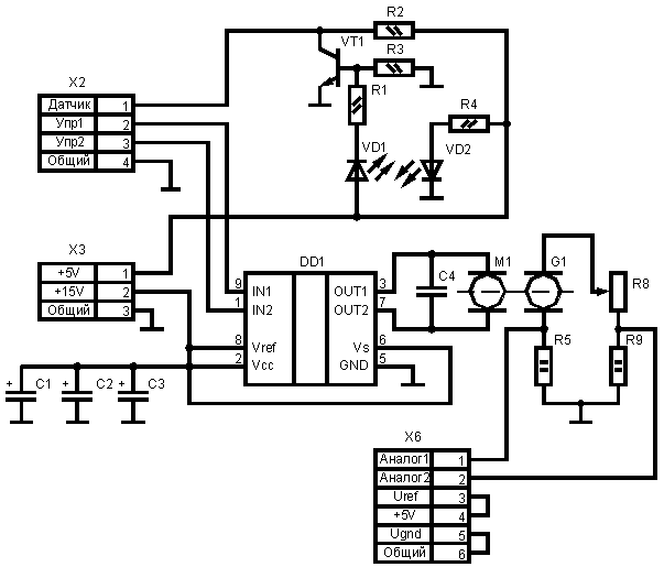 Лабораторная установка состоит из следующих частей: платы управления ПМК, платы двигателя и блока питания. Плата двигателя рис.6.1 состоит из трех блоков: блок датчика скорости вращения, блок управления, блок датчика нагрузки. Плата двигателя подключается к разъемам портов ПМК при помощи разъемов. X2 подключается к порту Р3 и служит для соединения: оптопары (“Датчик”) со входом прерывания INT1, портов Р3.4 Р3.5 с входами блока управления (Упр1 и Упр2). X6 подключается к порту Р6 используя две линии AI6 и AI7 для измерения нагрузки прелагаемой к двигателю с помощью генератора (измерение нагрузки прелагаемой из вне при помощи этой схемы невозможно). Использование двух каналов предусматривается для измерения напряжения двигателя с возможным реверсом когда при вращении в одну сторону измерение происходит с первого канала, а при вращении в другую со второго. Такое распределение получается путем использования делителя напряжения общий конец которого соединен с нулевым проводом и при протекании тока в разных направлениях меняет знак напряжения на концах делителя относительно общего провода на противоположный. Опорное напряжение Uref подается соединением +5В, а нижняя граница (Ugnd) задается соединением с общим.