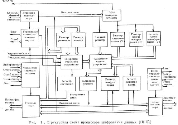 Во всех этих случаях широко используется микропроцессорная периферийная БИС 9518 фирмы Advanced Micro Devices, способная обеспечить шифрование и дешифрование данных в соответствии со стандартом на шифрование данных национального бюро стандартов США. Рекомендованная скорость при этом примерно 14 Мбит/с. Чтобы использовать БИС в большинстве телекоммуникационных систем, не прибегая к буферизации данных, такой производительности вполне достаточно. БИС 9518, получившая название процессора шифрования данных (ПШД), выполнена по n-МОП-технологии, размещена в 40-выводном корпусе и предназначена для работы под управлением микропроцессора. При условии применения во внешних устройствах памяти, ПШД засекречиваниет данные в процессе обмена с накопителями на магнитных дисках или лентах под управлением контроллера запоминающего устройства, большинство которых выполнено на базе микропрограммируемых секционированных микропроцессоров. Управление ПШД осуществляет обычно однокристальный микропроцессор, например, такой, как 28000. ПШД 9518 обеспечивает реализацию трех режимов шифрования, предусмотренных стандартом на шифрование данных. Кроме упомянутой БИС для засекречивания данных широко используется также идентичная периферийная БИС 8068 микропроцессорного семейства АmZ8000.