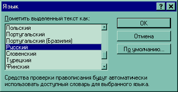 Назначение языка Если документ содержит текст на иностранном языке или же текст, который необходимо исключить из проверки, то перед использованием проверочных средств мы должны выполнить действия, рассмотренные в этом разделе. В русской версии Word весь текст изначально помечается как написанный на русском языке. Если документ частично или полностью составлен на иностранном языке и мы хотим его проверить, необходимо пометить каждый фрагмент иностранного текста следующим образом: Выделите текст на иностранном языке. Выполните команду Язык ( lanquaqe ) в меню Сервиз (Tools) , чтобы открыть окно диалога Язык (Lanquaqe). Выберите из списка язык текста. Чтобы выбранный язык использовался в Word по умолчанию, нажмите кнопку По умолчанию (Default). Язык относится к атрибутам символов. При нажатии кнопки По умолчанию Word назначает атрибут языка стилю Обычный (Normal) документа и шаблону документа. Такое присваивание относится ко всему тексту текущего документа, основанному на стиле Обычный , и ко всем новым документам, созданным на основе этого шаблона.