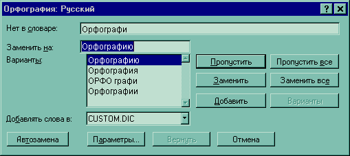 Из контекстного меню следует выбрать: Один из предложенных вариантов написания слова для его исправления. Команду Пропустить все (Iqnore all), заставляющую Word на время текущего сеанса прекратить выделение слова. Команду Добавить (Add) , заносящую слово в вспомогательный словарь. Команду Орфография (Spellinq) , открывающую описанное в следующем разделе окно диалога Орфография. Для автоматического исправления ошибок во время ввода текста можно воспользоваться Автозаменой .