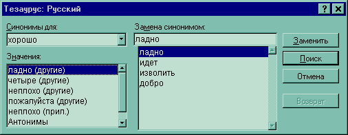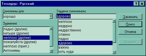 Нажмите Shift+F7 или выполните команду Тезаурус в меню Сервис. Вот как оно выглядит, когда в документе выделено слово “хорошо” : В списке Значение выберите нужное значение слово. В списке Заменить на появляется перечень синонимов для выбранного значения. Выделите самый удачный синоним (антоним, связанное слово) в списке Заменить на и нажмите кнопку Заменить. На рис. 3 показано окно диалога Тезаурус для слова “хорошо”, с выбранным значением “неплохо” и синонимом “здорово”.