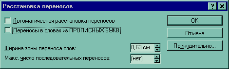 2.4.1. Автоматическая расстановка переноса в документе . Вы можете поручить Word автоматически расставлять переносы в активном документе. Это происходит так: Командой Расстановка переносов (Hyphenation) в меню Сервис откройте окно диалога Расстановка переносов, изображенное на рисунке :