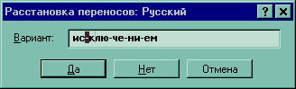Предлагаемые позиции переноса Вам на выбор предоставляется несколько возможностей: Чтобы установить перенос в предлагаемом месте, нажмите кнопку Да ( Yes ). Чтобы вставить разрыв в другое место, установите туда курсор и нажмите кнопку Да. Чтобы отказаться от переноса слова, нажмите кнопку Нет (No ) (вместо переноса будет переведена строка).