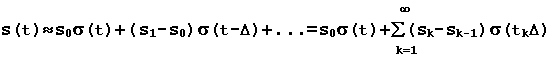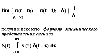 Если теперь шаг D устремить к нулю. то дискретную переменную k D можно заменить непрерывной переменной t . При этом малые приращения значения сигнала превращаются в дифференциалы ds = (ds/d t ) d t , и мы получаем формулу динамического представления произвольного сигнала посредством функций Хевисайда