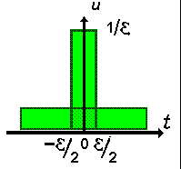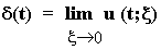 Например, если u - напряжение, то П = 1 В*с. Пусть теперь величина Е стремится к нулю. Импульс, сокращаясь по длительности, сохраняет свою площадь, поэтому его высота должна неограниченно возрастать. Предел последовательности таких функций при x ® 0 носит название дельта-функции , или функции Дирака :