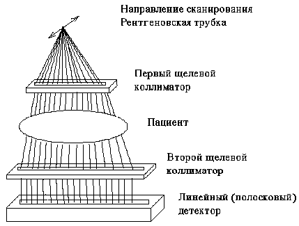 В цифровой рентгенографии применяют усилитель изображения, ионографическую камеру и устройство с вынужденной люминисценцией. Эти приемники могут непосредственно формировать цифровые изображения без промежуточной регистрации и хранения. Усилители изображения не обладают наилучшим пространственным разрешением или контрастом, однако имеют высокое быстродействие. Аналого-цифровое преобразование флюорограммы с числом точек в изображении 512х512 может занимать время менее 0,03 с. Даже при числе точек 2048х2048 в изображении время преобразования изображения в цифровую форму составляет всего несколько секунд. Время считывания изображения с пластины с вынужденной люминисценции или ионографической камеры значительно больше, хотя последнее выгодно отличается лучшим разрешением и динамическим диапазоном. Записанное на фотопленке изображение можно преобразовать в цифровую форму с помощью сканирующего микроденситометра, но любая информация, зафиксированная на фотопленке со слишком малой или, наоборот, слишком высокой оптической плотностью, будет искажена из-за влияния характеристик пленки. В цифровую форму можно преобразовать и ксеро- рентгенограмму также с помощью сканирующего денситометра, работающего в отраженном свете, или путем непосредственного считывания зарядового изображения с селеновой пластины. В России прямая цифровая рентгенографическая система Института ядерной физики (ИЯФ) СО РАН применяется в нескольких клинических больницах. В этой системе рентгеновская пленка как регистратор рентгеновского излучения заменена многопроволочной пропорциональной камерой. Такая камера вместе с электронными схемами усиления и формирования импульсов представляет собой линейку на 256 практически независимых каналов, имеющих чувствительную поверхность 1х1 мм. (В последних моделях 350 каналов и 0,5х0,5 мм.) Использование в счетчиках в качестве рабочего газа ксенона при давлении 3 кгс/см2 обеспечивает высокую эффективность регистрации излучения. Эта система может быть отнесена к классу ионографических приборов для цифровой рентгенографии, передающих изображение на внешние устройства отображения. В других цифровых рентгенографических системах используют твердотельные приемники с высоким коэффициентом поглощения рентгеновского излучения. В обоих разновидностях упомянутых рентгенографических систем применяется метод сканирования с построчной регистрацией изображения, которое воспроизводится в целое на дисплее компьютера (сканирующая проекционная рентгенография). Ко второму классу цифровых рентгенографических систем следует отнести люминофоры с памятью и вынужденной люминисценцией, которая затем регистрируется. Это приемник с непосредственным формированием изображения. Системы получения изображения со сканированием рентгеновским пучком и приемником имеют важное преимущество, состоящее в том, что в них хорошо подавляется рассеяние. В этих системах один коллиматор располагается перед пациентом с целью ограничения первичного рентгеновского пучка до размеров, необходимых для работы приемника, а другой - за пациентом, чтобы уменьшить рассеяние. На рис.2 изображена линейная сканирующая система для получения цифрового изображения грудной клетки. Приемником в системе является полоска из оксисульфида гадолини