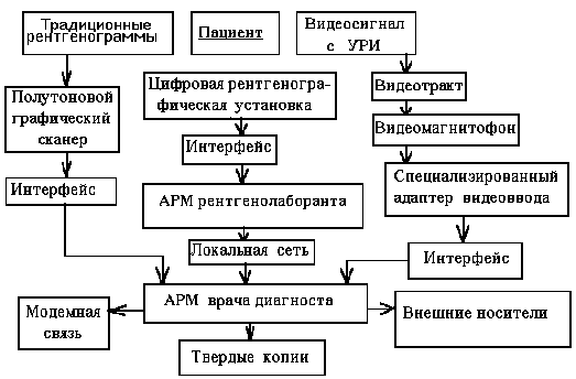 Первый канал. Рентгенограммы, полученные с помощью традиционного процесса, поступают на обработку в полутоновый графический сканер, с помощью которого рентгенодиагностическое изображение вводится в память компьютера. После этого такая преобразованная рентгенограмма может обрабатываться средствами компьютерной техники, но в рамках узкого динамического диапазона рентгеновской пленки. Это изображение может быть введено в электронный архив и извлекаться оттуда по требованию. Эта оцифрованная рентгенограмма уже ничем не отличается от прямых цифровых рентгенограмм по доступности средствам обработки. Третий канал. Рентгеновские изображения из рентгенотелевизионного канала УРИ могут захватываться специализированным адаптером видеоввода как в режиме реального времени, так и с видеомагнитофонного кадра. Последнее предпочтительно, так как позволяет при просмотре видеомагнитофонных изображений выбрать нужный кадр для занесения его в архив. Объектом ввода в электронный архив могут быть любые изображения, получаемые при рентгеноскопии с помощью УРИ. Первый и третий каналы дают возможность преобразовать традиционные рентгеновские изображения (рентгенограммы и кадры видеотелевизионного тракта) в цифровое изображение. Этот прием имеет особое значение, потому что он представляет возможность достоверно сравнить изображения, полученные различными способами. Следующим преимуществом преобразования являются возможность помещения его в электронный архив и выполнение всех операций с цифровым изображением. Следует особенно подчеркнуть возможность передачи изображения по компьютерным сетям, потому что в последние годы " взгляды медиков фокусируются на передачe изображений " как основном средстве обеспечения доступа к материалам, что имеет колоссальное значение как для диагностики, так и для процессов обучения. Второй канал. Это собственно канал цифровой рентгенографической установки. Он состоит из двух подсистем: автоматизированного рабочего места (АРМ) лаборанта и АРМ врача-рентгенолога (ВР), объединенных в локальную сеть. В АРМ рентгенолаборанта происходит внесение сведений о больном, необходимых организационных и клинических данных и управление процессом регистрации изображения (синхронное включение сканера и высокого напряжения и др.). После получения рентгеновского изображения оно и сведения о пациенте по локальной сети поступают в АРМ ВР. При этом процесс рентгенографии и передачи изображений от АРМ лаборанта в АРМ врача происходит без промедлений и в реальном времени, не прерывая работы врача ни на одной ступени, т.е. происходит непрерывная и независимая работа на обоих рабочих местах. На АРМ ВР выполняются программная обработка изображений для извлечения диагностической информации, поиск предшествующих изображений пациентов и сравнение с вновь полученными, регистрация новых пациентов и изображений в базе данных, приведение их к формату, оптимальному для архивирования, и другие манипуляции, доступные электронным технологиям персонального компьютера. Программное обеспечение позволяет врачу-рентгенологу при необходимости и создать твердые копии изображений на лазерном принтере ( этот способ получения твердых копий несколько уступает в точности передачи диагностических изображений теплопеча