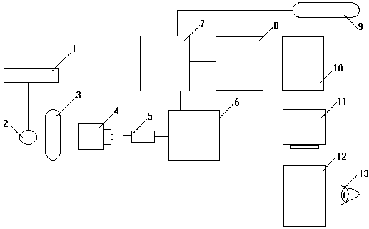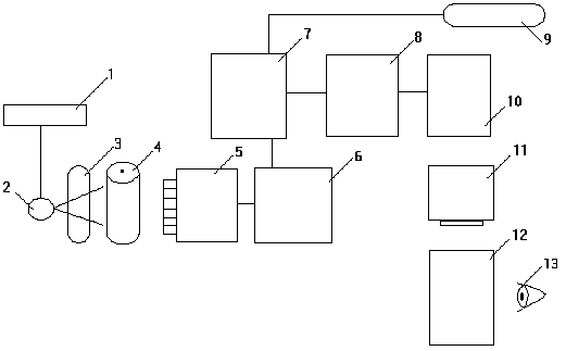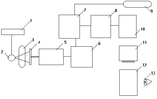 Рис.5 Цифровая рентгенография с экрана ЭОП 1-генератор; 2-рентгеновская трубка; 3-пациент; 4-ЭОП; 5-видеокамера; 6-аналого-цифровой преобразователь; 7-накопитель изображений; 8-видеопроцессор; 9-сеть; 10-цифро-аналоговый преобразователь; 11-монитор; 12-снимок; 13-рентгенолог.