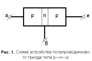 Триод р—n—р типа состоит из трёх областей, крайние из которых обладают дырочной проводимостью, а средняя — электронной. К этим трём областям триода делаются самостоятельные контакты а , б и в , что позволяет подавать разные напряжения на левый р—n-переход между контактами а и б и на правый n—р-переход между контактами б и в . Если на правый переход подать обратное напряжение, то он будет заперт и через него будет протекать очень малый обратный ток. Подадим теперь прямое напряжение на левый р—n-переход, тогда через него начнёт проходить значительный прямой ток. Одна из областей триода, например левая, содержит обычно в сотни раз большее количество примеси р-типа, чем количество n-примеси в n-области. Поэтому прямой ток через р—n-переход будет состоять почти исключительно из дырок, движущихся слева направо. Попав в n-область триода, дырки, совершающие тепловое движение, диффундируют по направлению к n—р-переходу, но частично успевают претерпеть рекомбинацию со свободными электронами n-области. Но если n-об-ласть узка и свободных электронов в ней не слишком много (не ярко выраженный проводник n-типа), то большинство дырок достигнет второго перехода и, попав в него, переместится его полем в правую р-область. У хороших триодов поток дырок, проникающих в правую р-область, составляет 99% и более от потока, проникающего слева в n-область. Если при отсутствии напряжения между точками а и б обратный ток в n— р-переходе очень мал, то после появления напряжения на зажимах а и б этот ток почти так же велик, как прямой ток в левом переходе. Таким способом можно управлять силой тока в правом (запертом) n—р-переходе с помощью левого р—n-перехода. Запирая левый переход, мы прекращаем ток через правый переход; открывая левый переход, получаем ток в правом переходе. Изменяя величину прямого напряжения на левом переходе, мы будем изменять тем самым силу тока в правом переходе . На этом и основано применение р—n—р-триода в качестве усилителя.