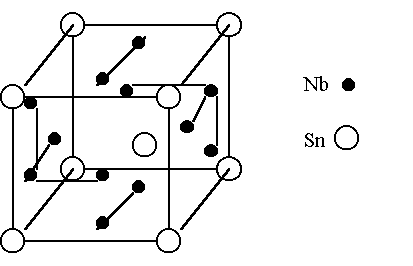Соединение Nb 3 Sn имеет следующие параметры: Т к =18.2К, Н к2 =18.5 МА/m ( m 0 Н к =23Тл) при 4.2К. Благодаря таким параметрам можно получить джозефсоновские переходы чувствительные как к малым магнитным полям 10 -17 Тл, так и к изменению больших магнитных полей » 1Тл. Соединение Nb 3 Sn имеет такую решетку: атомы ниобия расположены в местах, занятых на рисунке и образуют со своими ближайшими соседями три цепочки, перпендикулярные друг другу. Атомы ниобия в этих цепочках связаны дополнительными ковалентными связями. Цепочки ниобия в кристаллической структуре, для получения сверх проводящих свойств не должны быть нарушены, что может произойти при избытке атомов олова или при недостаточной степени порядка в кристаллической решетке. Диаграмма фазового равновесия системы Nb-Sn приведена на рисунке: