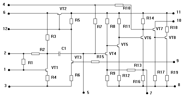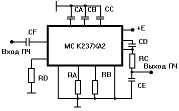 Микросхема К 237 ХА 2 предназначена для усиления и детектирования сигналов ПЧ (промежуточной частоты) радиоприемных устройств не имеющих УКВ диапазона, а также для усиления напряжения АРУ (автоматической регулировки усиления). Широкополосный усилитель ПЧ состоит из регулируемого усилителя на транзисторах Т4, Т5 и Т6. Усиленный сигнал поступает на детектор АМ-сигналов (амплитудно-модулированных сигналов), выполненный на составном транзисторе Т7, Т8. Низкочастотный сигнал с резистора R19, включенного в эмиттерную цепь, подается через внешний фильтр на предварительный усилитель НЧ (низкой частоты), а также через резистор R15 на базу транзистора Т3, входящего в усилитель АРУ. Усиленное напряжение АРУ снимается с эмиттера транзистора Т2. Изменение напряжения на эмиттере транзистора Т2 вызывает изменение напряжения питания транзистора Т1, а следовательно и его усиления. На частоте 465 кГц коэффициент усиления усилителя ПЧ составляет 1200 - 2500. Коэффициент нелинейных искажений не превышает 3%. Если входной сигнал меняется от 0,05 до 3 мВ, то изменение выходного напряжения не превышает 6дБ. Напряжение на выходе системы АРУ при отсутствии выходного сигнала составляет 3 - 4,5 В. Напряжение питания составляет 3,6 - 10 В. Потребляемая мощность не более 35 мВт.