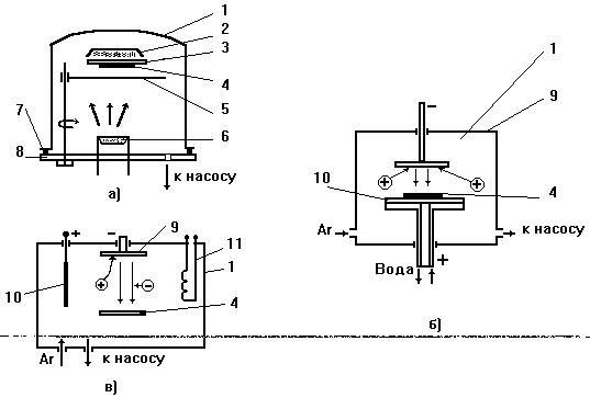 Рис. 5. Методы осаждения тонких пленок а) - термическое испарение в вакууме; б) - катодное распыление; в) - ионно-плазменное распыление; 1 - колпак; 2 - нагреватель подложки; 3 - подложкодержатель; 4 - подложка; 5 - заслонка; 6 - испаритель; 7 - прокладка; 8 - опорная плита; 9 - катод-мишень; 10 - анод; 11 - термокатод