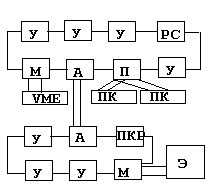 рис. 5. Применение системы РСИ. У-узел РСИ, А-агент, М-агент-мост, П-агент-переключатель, РС-рабочая станция в стандарте РСИ, VME-крейт VME, ПК-персональный компьютер, ПКР-персональный компьютер в стандарте РС, Э-сеть Ethernet.
