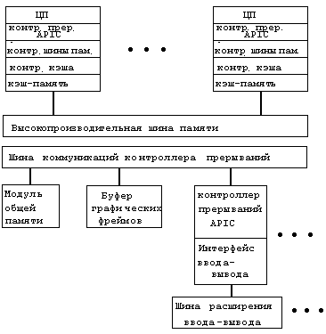 МП-спецификация определяет системную архитектуру на основе следующих компонентов аппаратуры:системные процессоры, контроллеры APIC, системная память, шина расширения ввода-вывода. Системные процессоры. В целях обеспечения совместимости с существующими программными средствами для PC/AT, спецификация основывается на процессорах семейства Intel 486 или Pentium. Хотя все процессоры в МП-системе функционально идентичны, спецификация выделяет два их типа:загрузочный процессор(BSP) и прикладные процессоры(AP). Какой процессор играет роль загрузочного, определяется аппаратными средствами или совместно аппаратурой и BIOS. Это сделано для удобства и имеет значение только во время инициализации и выключения. BSP-процессор отвечает за инициализацию системы и за загрузку ОС. AP-процессор активизируется после загрузки ОС. Контроллеры APIC. Данные контроллеры обладают распределенной архитектурой, в которой функции управления прерываниями распределены между двумя функциональными блоками:локальным и ввода-вывода. Эти блоки обмениваются информацией через шину, называемую шиной коммуникаций контроллера прерываний(ICC-interrupt communication controller). В МП-системе множество локальных блоков и блоков ввода-вывода могут коллективно использовать одну запись, взаимодействуя через шину ICC. Блоки APIC совместно отвечают за доставку прерывания от источника прерываний до получателей по всей МП-системе. Блоки APIC дополнительно увеличивают расширяемость за счет разгрузки шины памяти от трафика прерываний, а также разделения между процессорами нагрузки по обработке прерываний. Благодаря распределенной архитектуре, локальные блоки или блоки ввода-вывода могут быть реализованы в отдельной микросхеме или интегрированы с другими компонентами системы. Системная память. В системах, совместимых с МП-спецификацией, используется архитектура памяти стандарта AT. Вся память используется как системная за исключением адресов, зарезервированных под устройства ввода-вывода и BIOS. МП-системы нуждаются в значительно более высокой пропускной способности по сравнению с однопроцессорными. Требования возрастают пропорционально числу процессоров на шине памяти. Поэтому спецификация содержит рекомендации использовать кэши второго уровня, призванные снизить трафик по шине и реализующие следующие функции:стратегия обновления с обратной записью и протокол определения согласованности кэшей. От кэшей второго уровня и контроллеров шины памяти требуется, чтобы они были полностью прозрачны для программных средств. Шина расширения ввода-вывода . Спецификация обесречивает построение МП-систем на основе платформ PC/AT, отвечающих промышленным стандартам. В проектах могут быть использованы стандартные шины ISA, EISA, MCA, VL и PCI. BIOS выполняет функции слоя, изолирующего особенности аппаратных средств от ОС и программных приложений. Стандартный однопроцессорный BIOS выполняет следующие функции:проверяет системные компоненты;строит таблицы конфигурации, используемые ОС;инициализирует процессор и всю остальную систему. В многопроцессорных системах BIOS дополнительно выполняет следующие функции:передает информацию о конфигурации в ОС, которая идентифицирует все процессоры и другие компоненты МП-систем;переводит все процессоры и другие компоненты многопроцессорной системы в заданное состояние. 