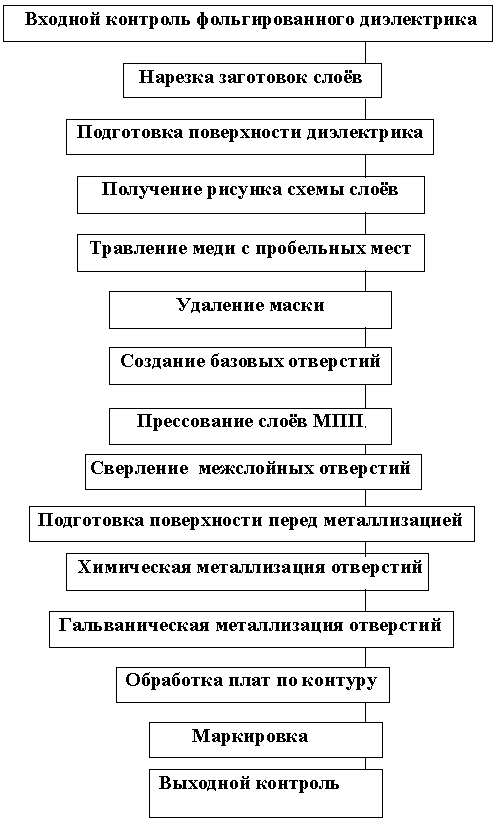 Мпп изготавливают методами построенными на типовых операциях используемых при изготовлении ОПП и ДПП. Исходя из соображений технологичности производства, я выбираю метод металлизации сквозных отверстий, так как он наиболее подходит к выбранной мною схеме среднесерийного производства.